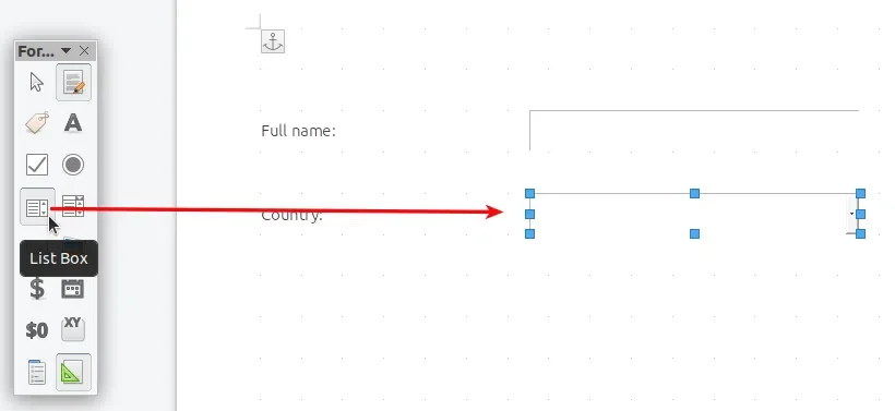 Na barra de ferramentas do LibreOffice Form Controls, pressione o botão Caixa de seleção e desenhe-o em seu documento clicando e segurando o botão esquerdo do mouse: