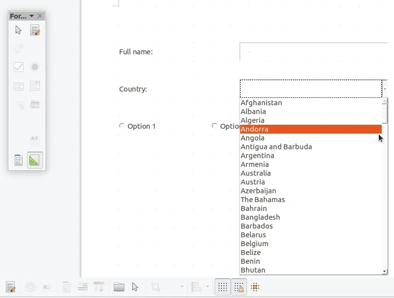Você também pode adicionar alguns botões de opção, chamados botões de opção no LibreOffice. Na barra de ferramentas de controles de formulário do LibreOffice, pressione o ícone Option Button e desenhe-o onde deseja colocá-lo em seu documento do LibreOffice. Adicione quantos botões de opção desejar: