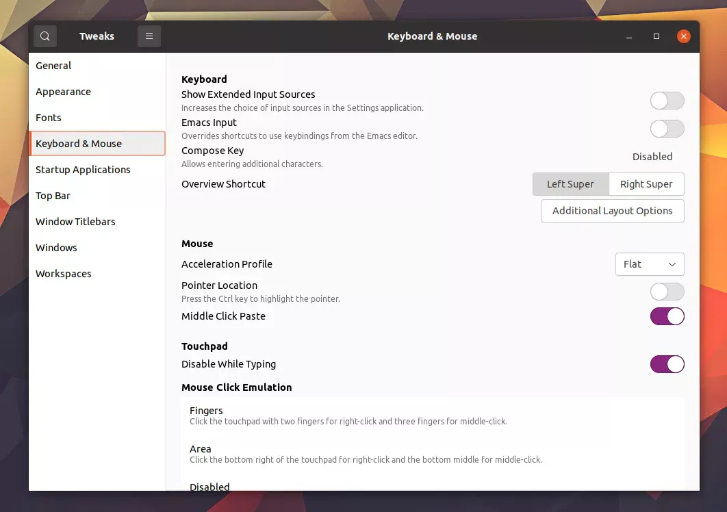 Desativanr o touchpad enquanto digita é outra opção que não está disponível diretamente nas configurações do sistema GNOME Shell, mas você pode ativar isso usando o aplicativo GNOME Tweaks.