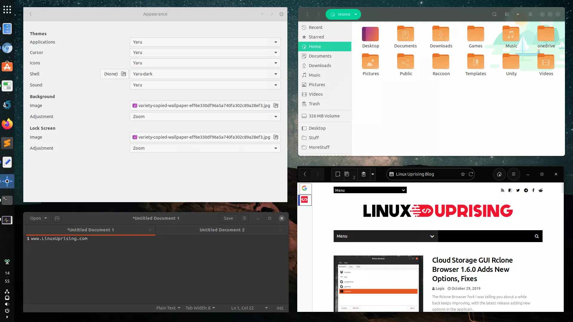 Nesta captura de tela, o Tweaks usa o tema Mint-Y, o Nautilus usa tema Canta, o Gedit usa Yaru-dark e o navegador Eolie (instalado do Flathub) usa o tema Plata. Eles estão todos funcionando ao mesmo tempo.