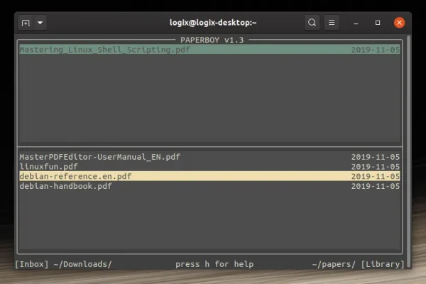 Paperboy é um utilitário de gerenciamento de PDF de linha de comando pequeno e simples escrito em Haskell que foi projetado para ajudar com documentos PDF baixados que não têm nomes de arquivo adequados / discerníveis. A ferramenta usa os metadados e o conteúdo do PDF para oferecer sugestões para renomear o arquivo, ao mesmo tempo que permite abrir o PDF para verificar seu conteúdo antes de renomeá-lo.
