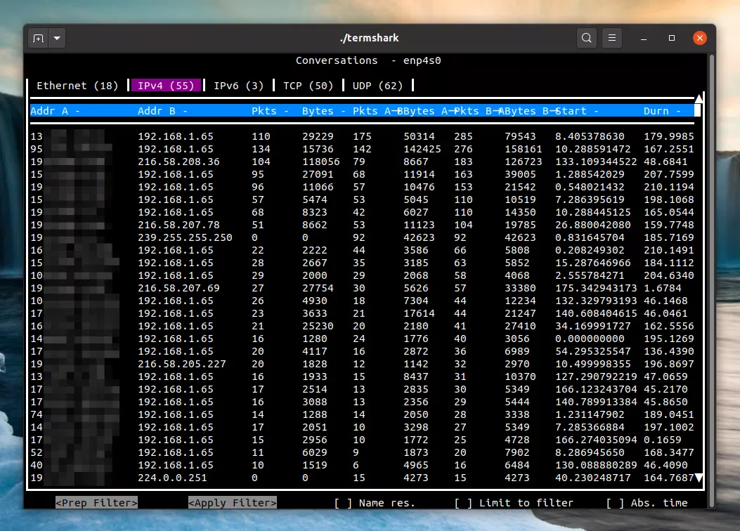 Analysis menu > Conversationstermshark -i eth0, mas com esta versão você pode especificar várias interfaces, por exemplo, termshark -i eth0 -i eth1 -i eth2c para o modo de cópia e, em seguida, pressione ctrl-c para copiar.z quando uma caixa de diálogo modal é abertaAlém disso, caso você tenha perdido, a versão anterior do Termshark (2.0.3) introduziu suporte para pacotes coloridos na visualização de lista por padrão, usando o Wireshark colorfilter, bem como suporte para as regras e5737ff5c5af47aba89bded863a789bded863a789 do TShark no formato de pacote timestcd9 para especificar o formato de pacote timest exibição de lista.